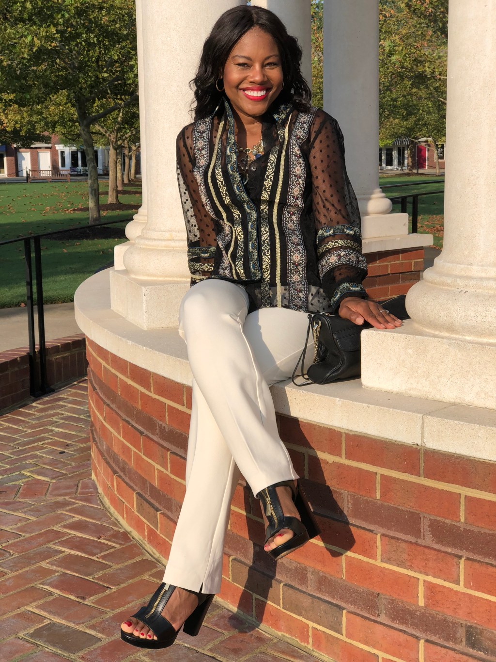 Bohemian looks– and I don’t mean tossing out your wardrobe and going full on Coachella, although that’s a great look too. What I do mean is being able to incorporate breezy carefree looks into your current style to make it look effortless but just a tad more chic. I tend to be a little more classic and have always sworn by effortless chic, but as I work my way towards the other end of 40 I want to be just a tad more adventurous. I have always loved the glamour of the 70’s and love the idea of mixing some of that in with my classic wardrobe. Big sunglasses, boho bags, jumpsuits, ponchos, and embroidered tops? Yes, please! I love the boho-inspired Tapestry Top from Chico’s that I’m wearing in the featured pic above. It’s part of their 35th Anniversary Line. You can shop it here