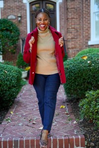 I love this London Fog Wool Scarf Coat because it’s such a versatile wardrobe piece. The length makes it appropriate for many different occasions and has that perfect Goldilocks Effect of not being too long or too short for any of your fall looks. I chose it in vibrant red because I love that it stands out too. I personally think that red looks great with so many other colors that it’s almost a neutral in my book, but for those who aren’t quite of that mindset it comes in three other gorgeous colors too. See them here.