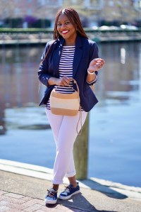 If you caught my last two posts you saw that I styled the Classic Wool Blazer in navy with a buttercup tee and midi skirt for a cute, flirty, and chic look. If you missed it you can see it here. My second look (also here) was an elevated classic look with a pretty button-down and a pair of white chinos. Today I’m going to share my third and final look, which is my version of a chic and sporty spring look.
