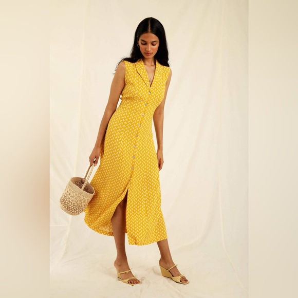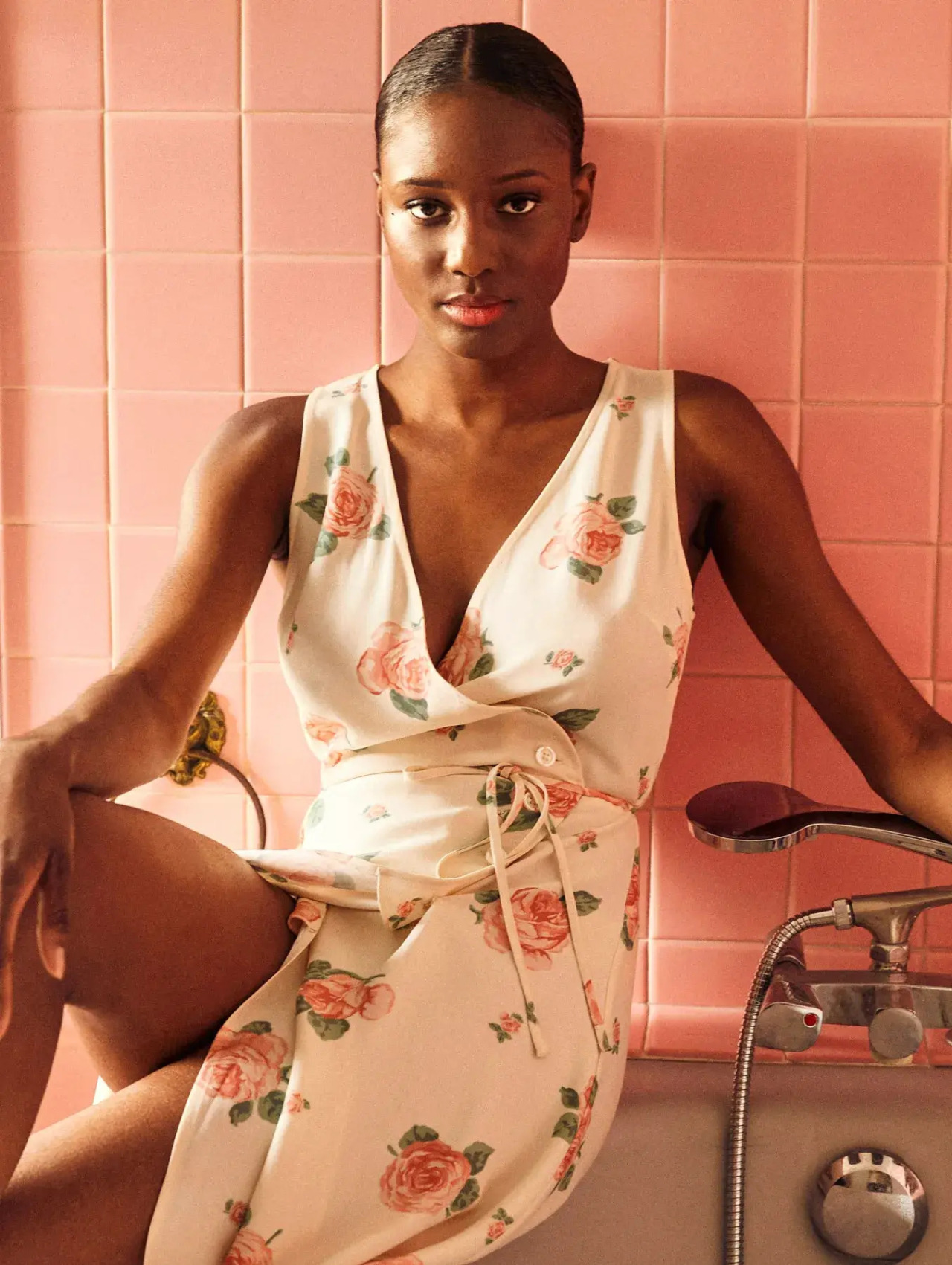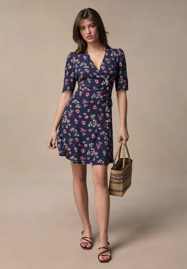 The Gabin Dress– The Gabin dress is the style that really put Rouje on the map. It’s a celeb and influencer favorite, and was even featured in the last James Bond film (pictured above). This dress is a midi length wrap dress with a five button closure and waist tie. It features a low v-neckline and short, gathered sleeves. Because this is their most iconic style, Rouje releases the Gabin dress in various prints every season. I first purchased the Gabin a few years ago in a red floral print. What I love about this dress is its versatility—It’s a great capsule wardrobe piece because it is so easy to dress up or down. I wore this dress for dates with my husband and walking around the city. That print was made out of a viscose fabric and unlined. I didn’t mind that the dress was unlined because it made the style feel light and breezy and it had enough design details to still feel like a well-made piece. I did feel like it ran a little small though, especially in the hip area. The low v-neckline and subtle slit also make this a dress that doesn’t work well for modest occasions unless you have the neckline pinned or altered. Last year I purchased another Gabin in white with pink and red flowers. On this version the skirt was lined. And the sizing had been adjusted to a more true to size fit. Overall I think the Gabin dress is a wardrobe hero that’s likely to garner a lot of compliments. This style has been replicated by other brands, but if you can splurge on the original I’d say go for it.