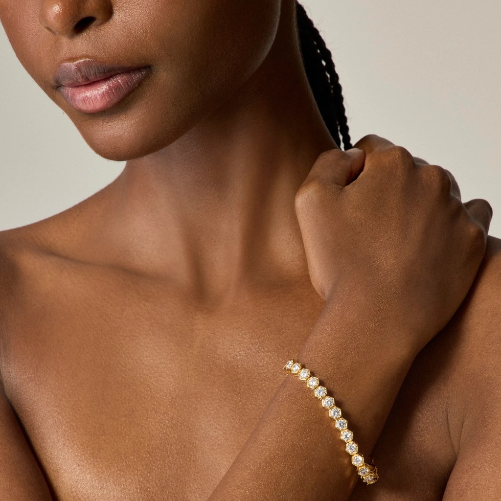 Meghan’s gold arm stack has become a part of her signature look. She wears a gold Cartier Tank Watch that belonged to Princess Diana along with a Cartier Love Bracelet, a Jennifer Meyer Bezel tennis bracelet, and an Ariel Gordon Hex Tennis bracelet.