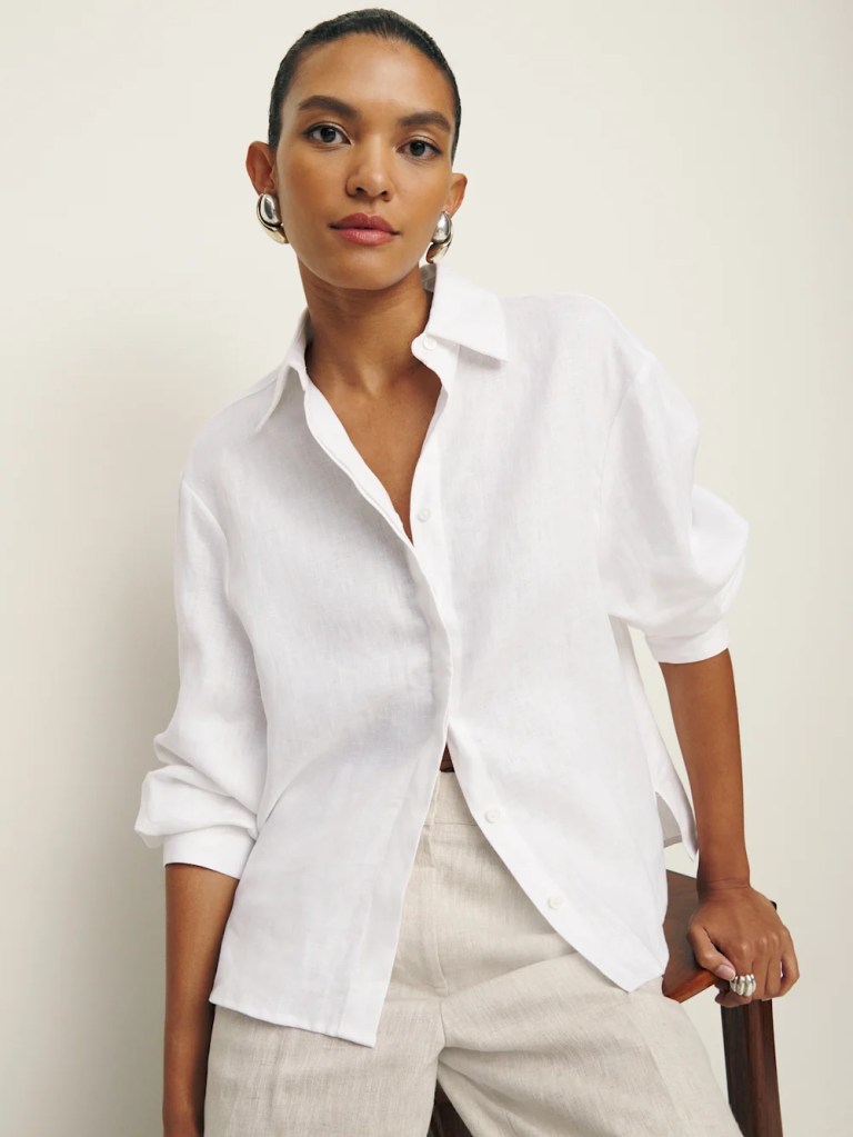 • Opt for a slightly oversized linen shirt (white, beige, or pinstripe).