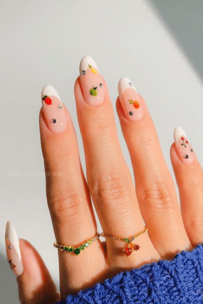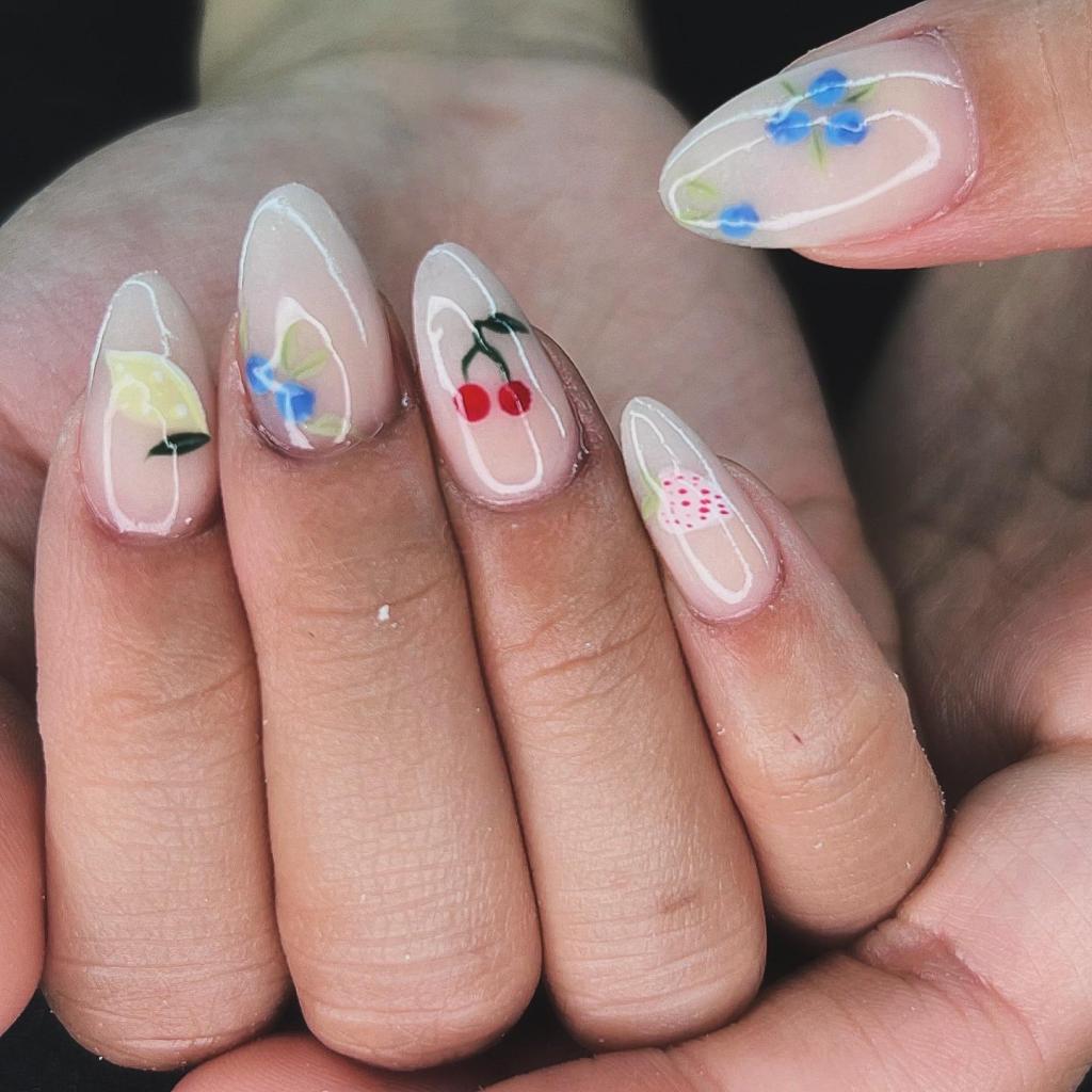 Tiny fruit designs like strawberries, oranges, and cherries add a playful touch to manicures. When paired with a neutral base, these microfruit accents become delightful focal points without being overpowering.