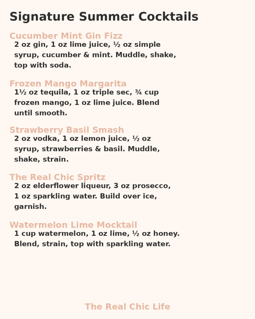 If you’d like more inspiration you might want to check out Pretty Simple Cocktails. Remember your signature summer cocktail isn’t just a drink—it’s a mood, a moment, and a little bit of magic. Once you find the one, make it yours all season long. Sip it slowly, serve it at gatherings, and let it become your liquid calling card.