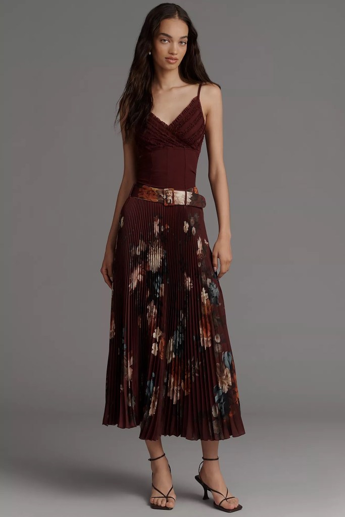 A-line or pleated midi skirts in silk or wool blends. Pair them with tights and boots as the weather cools.