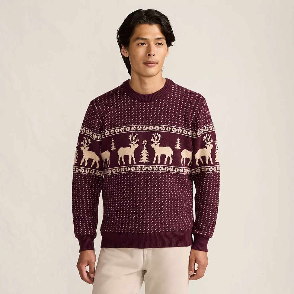 A festive sweater that hits the sweet spot between cozy holiday flair and timeless style, making it versatile for both casual parties and family gatherings.