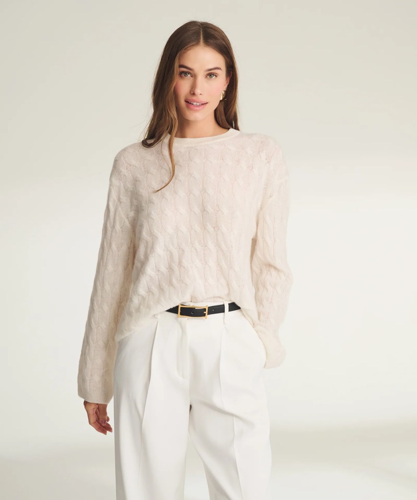 Holiday heroines favor pieces that feel gentle and classic. Midi skirts, A-line shapes, soft pleats, belted waists, and relaxed tailoring create that timeless movie feel. Avoid anything too ripped, overly baggy, or ultra-athletic. Even casual looks should have a polished softness.